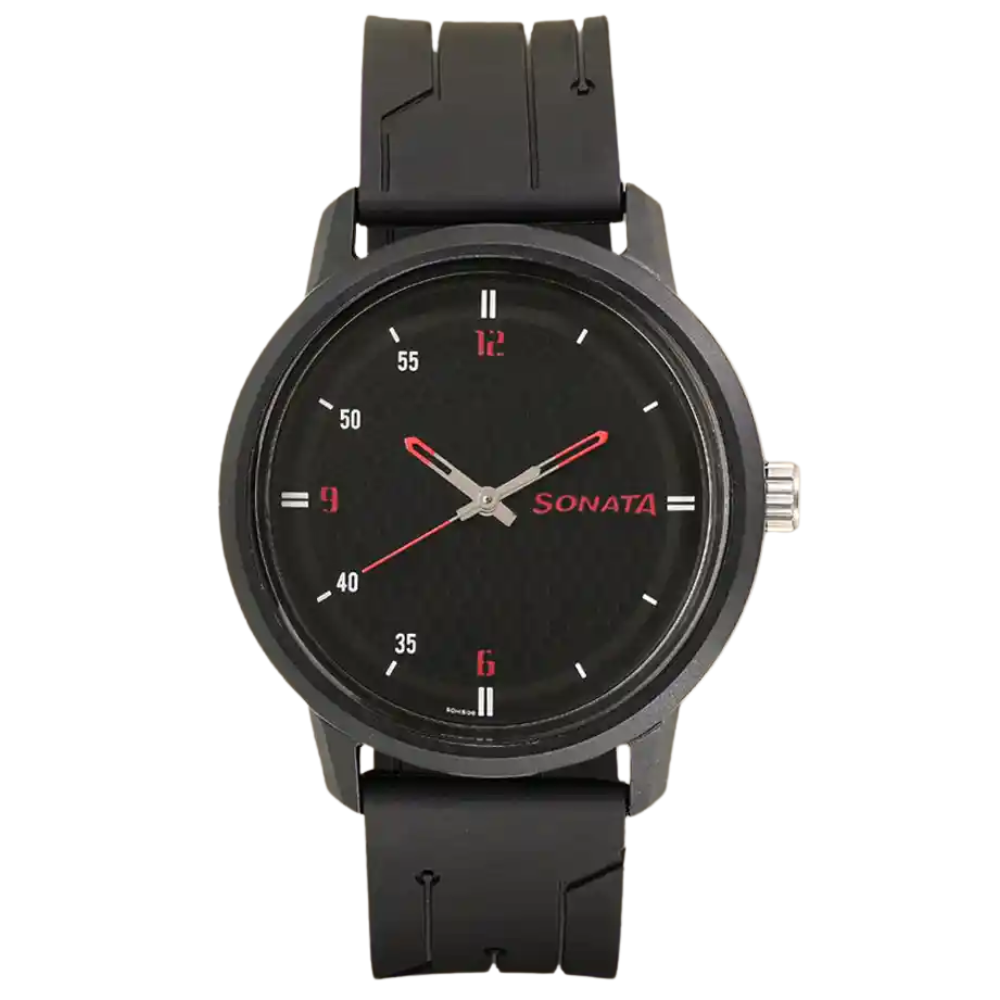 Sonata Volt 77085PP04 men’s analog watch with black dial, polyurethane strap, 52 mm case, acrylic crystal, and quartz movement. Lightweight, sporty, and ideal for everyday casual use.