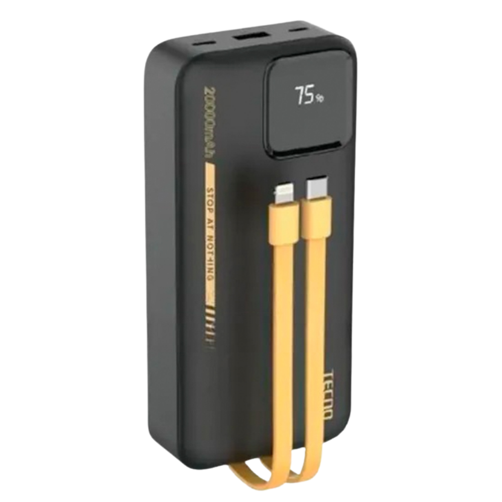 TECNO TPB-P204Q 20000mAh Power Bank with 22.5W fast charging, built-in Type-C & Lightning cable, multiple output ports, and durable PC+ABS body—perfect for heavy users and travel.