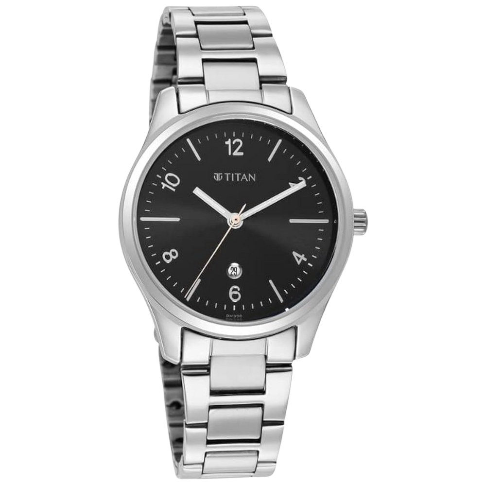 Discover the Titan 2639SM08 Women’s Analog Watch featuring a black dial, stainless steel strap, quartz movement, and 50M water resistance — elegance that fits every occasion.