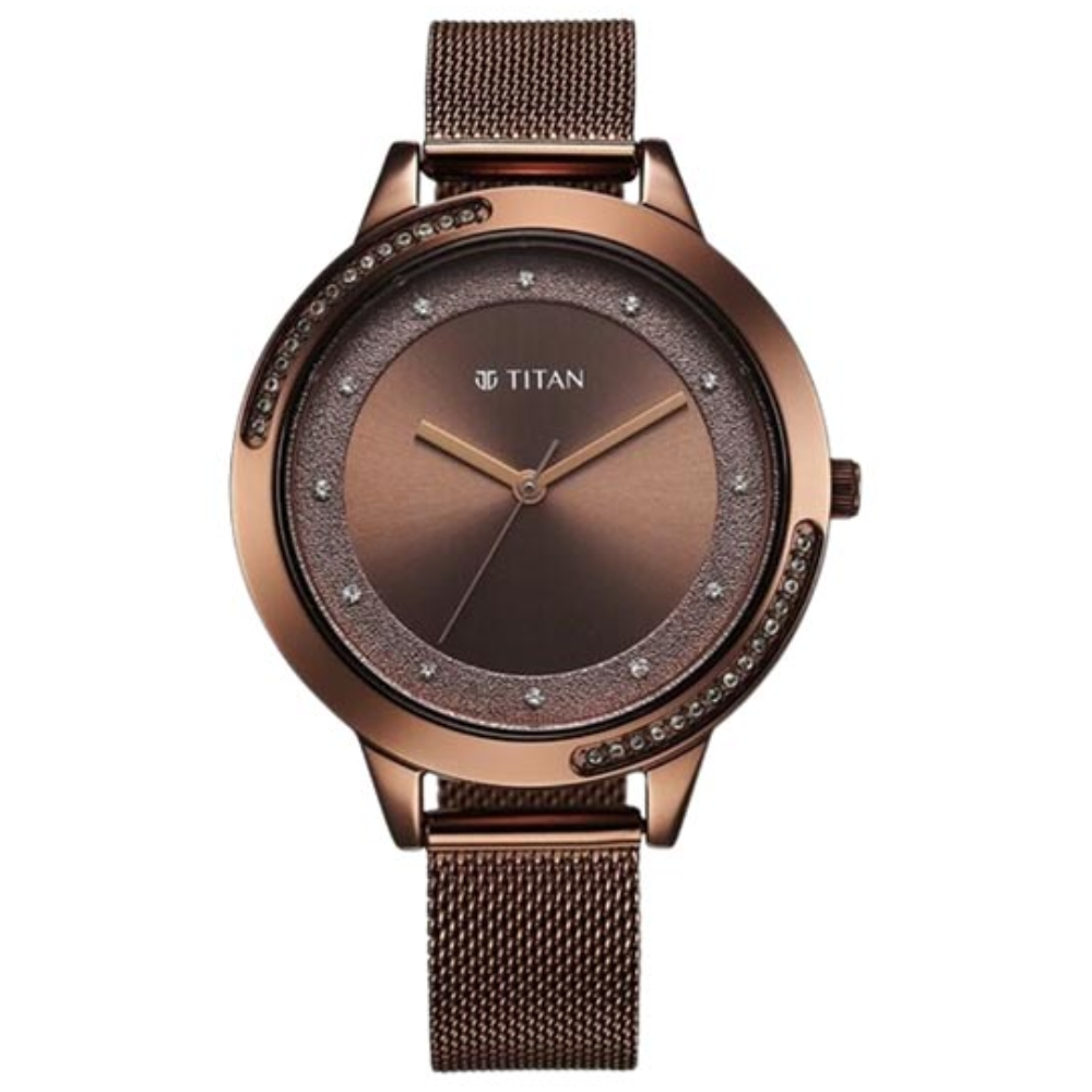 Add refined glamour to your look with the Titan Razzle Dazzle 2764QM01 — featuring a brown dial, mesh strap, and quartz movement for modern elegance.